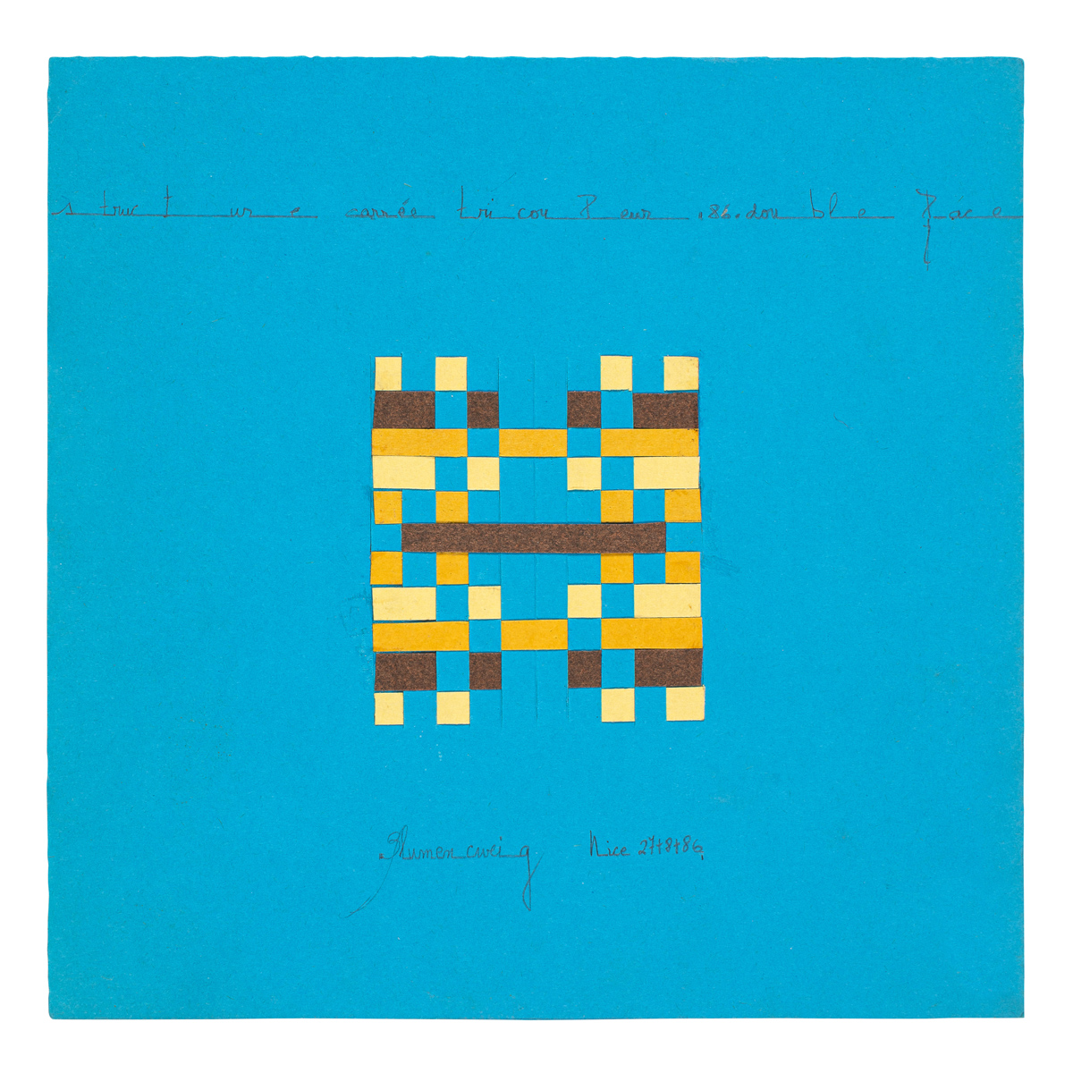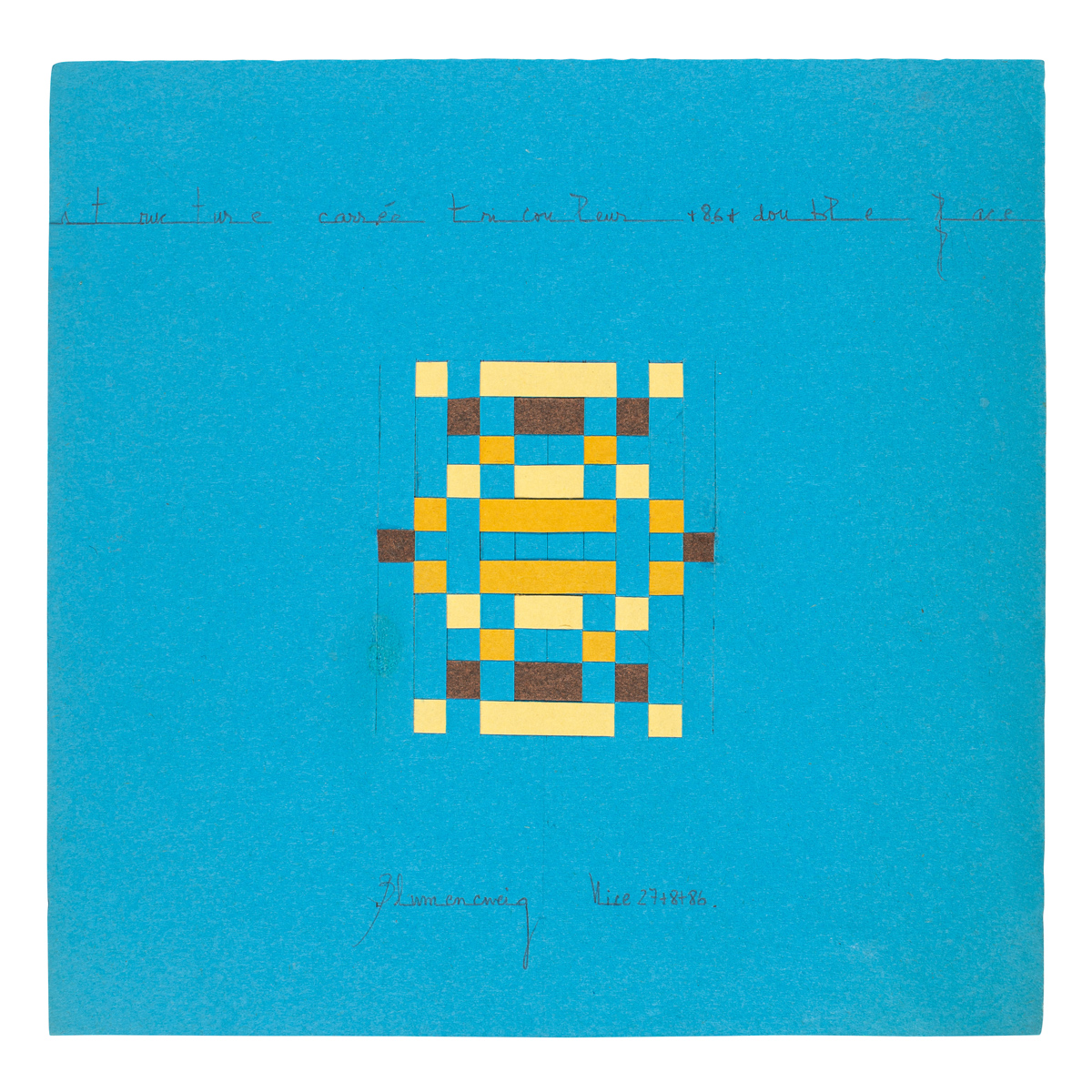 Titré et daté «Structure carrée tricouleur. 86» en haut au centre. Signé, situé et daté «Blumencweig Nice 27+8+86» en bas au centre. Idem au dos.